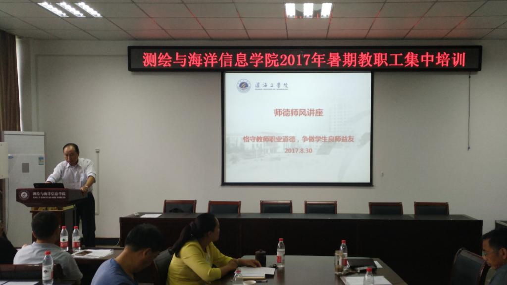 在创建江苏海洋大学关键时期,为了适应高等教育新常态,推进学院健康、快速发展,进一步加强师资队伍建设,提高教育教学质量,8月30日,测绘与海洋信息学院首次暑期教职工集中培训在测绘楼二楼会议室举行。学院党政领导及全院教职工参加了培训。会议由测绘与海洋信息学院党委书记冯凤麟主持。