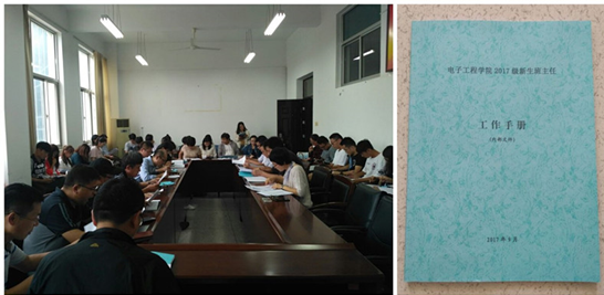 会议开始前,学院为全体新生班主任发放了最新编写的《电子工程学院2017级新生班主任工作手册》。手册涵盖了学院学生工作相关文件;2017级学生毕业条件、学位授予条件;新生招生录取情况分析、学院近三年升学出国详细情况及分析;近三年学生退学违纪情况及分析;学生奖惩办法;常见问题解答等14个工作模块,为新生班主任有效开展工作提供了保障。