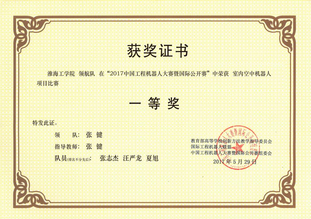 近日,由计算机工程学院张键副教授指导,汪严龙(计算机工程学院)、张志杰(理学院)、夏旭(理学院)等三位同学组成的“领航队”,在2017中国工程机器人大赛暨国际公开赛中获得室内空中机器人项目比赛一等奖。