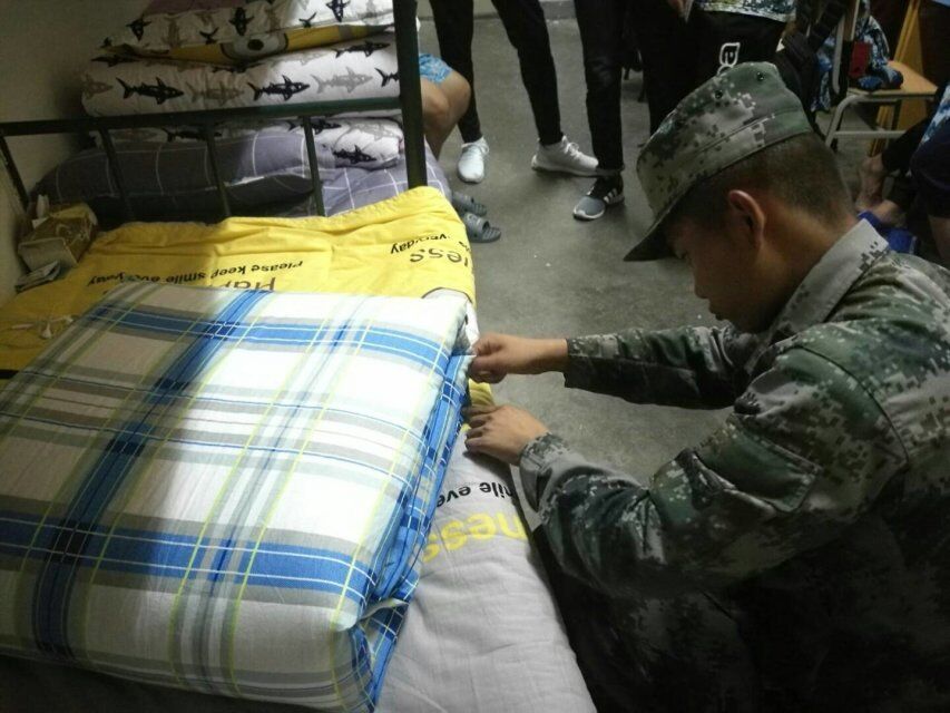 进入B区宿舍,教官们首先对学生们的内务摆放提出了要求,并向他们详细地示范了日常用品摆放位置和方法。比如:脸盆的摆放要整齐,洗漱用品归纳好后置于脸盆之内,毛巾也要叠好之后再摆放于脸盆中。最为精彩的便是教官向新生展示军被叠法的时刻:摊平被褥,几番折叠,捏出被角,干净利落的动作和标准的"豆腐块"模样赢得了同学们的声声惊叹和阵阵掌声。新生表示,虽然他们目前叠不出教官那般整齐、标准的军被,但是通过这段时间的训练,他们定会有所进步。检查完男生宿舍后,教官们又前往A区女生宿舍。相对于男生来说,女生要更加仔细认真,宿舍也更为干净整洁,但是有些内务整理的方法还是需要教官进行一定的指导示范。教官们表示,无论什么方法,整齐划一是内务整理最重要标准。