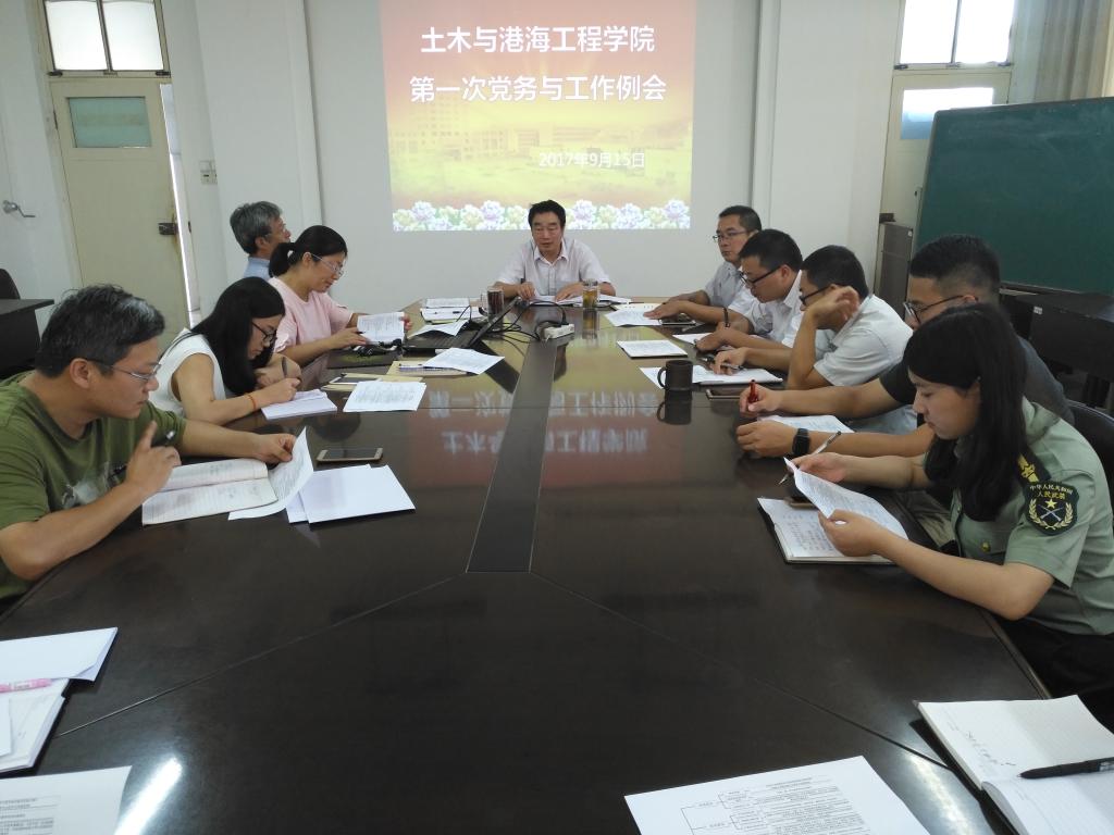 9月15日下午,土木与港海学院党委中心组学习习近平“7·26”重要讲话,并召开第一次党务与学工例会。学院院领导、党委成员、教工学生党支部书记、全体辅导员、党政办等管理人员参加。