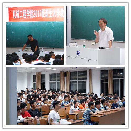 9月18日晚,在通灌校区至善楼102、105教室,机械学院院长文西芹和党委书记毛纪登分别围绕“成长成才”、“理想信念”的主题给2017级新生上了开学第一课,讲座由院党委副书记赵求勇主持,辅导员、班主任及全体391名新生参加并聆听了讲座。
