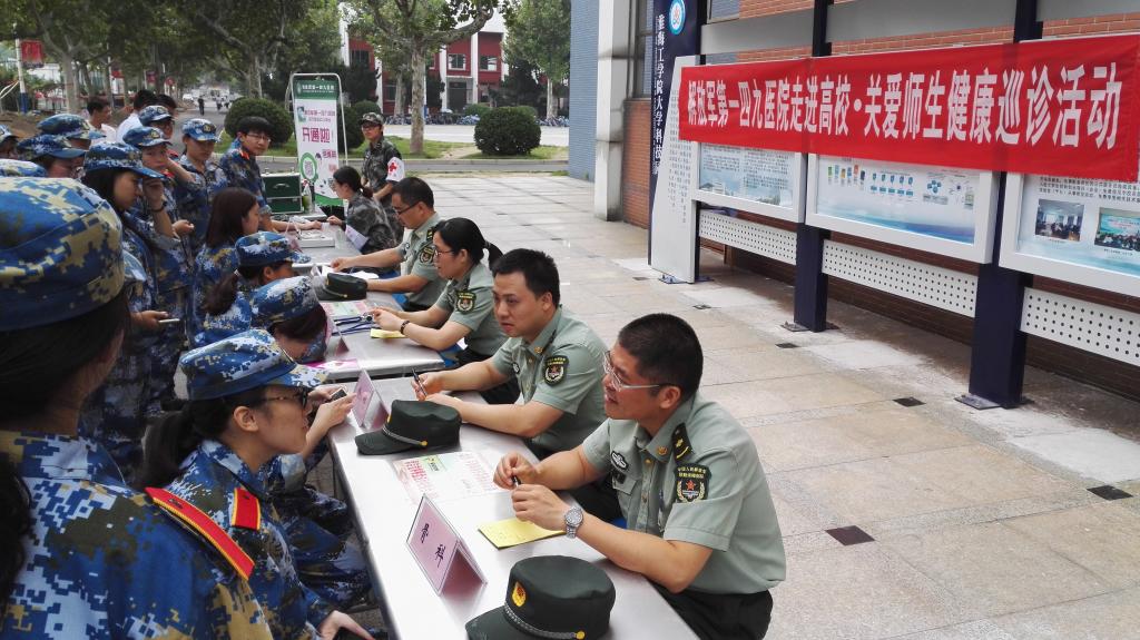 9月19日上午,淮海工学院通灌校区中心广场,外国语学院与解放军一四九医院联合开展了“走进高校·关爱健康巡诊活动”。活动对象主要为2017级军训新生。