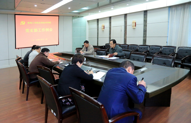 10月11日下午,应用技术学院党委召开工作会议,认真学习《淮海工学院基层党支部工作标准》,部署近期党务重点工作。应用技术学院党委书记周清华,党委副书记、副院长万金店,各党支部书记和党政办人员出席会议。