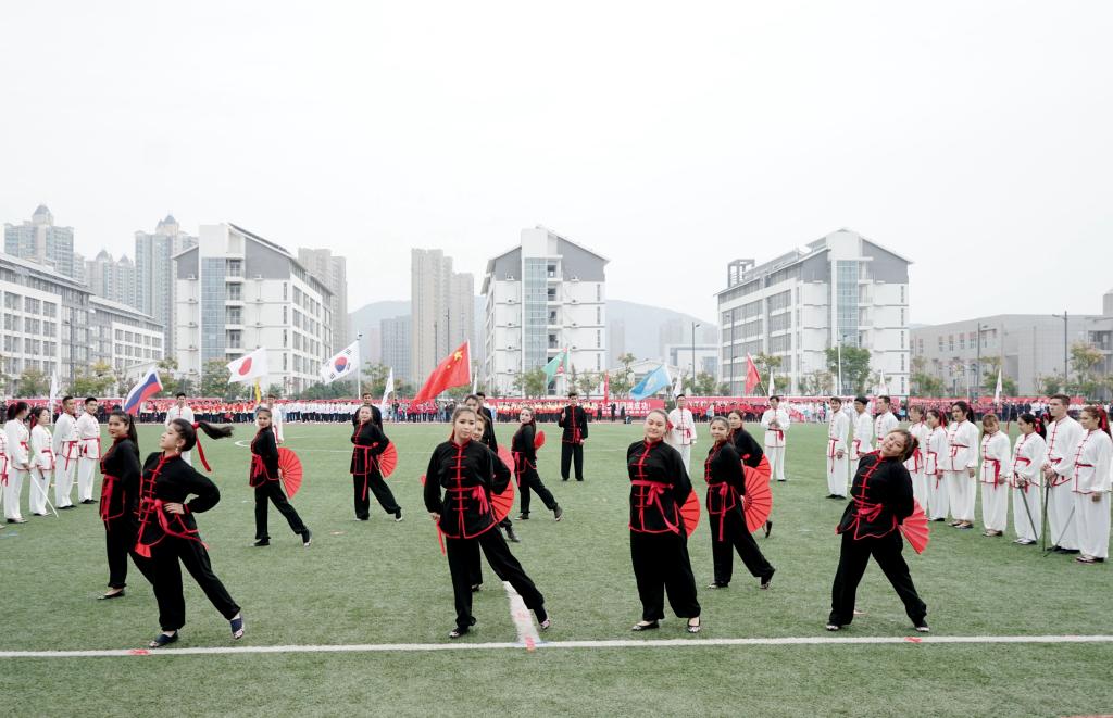 开幕式上,留学生们身着黑白两色的中国传统服装进行了一段太极表演,充分展示了剑术扇舞的刚柔并济、书法与功夫的文武双修,他们用自己的表演传达了对中国文化精髓的理解,用极富表现力的律动给观众带来了富有活力的视听体验。随后的方阵入场式中,留学生们手举本国国旗步入会场,他们面带笑容,不时挥动着手中的国旗向现场热情的观众致意,气氛热烈。