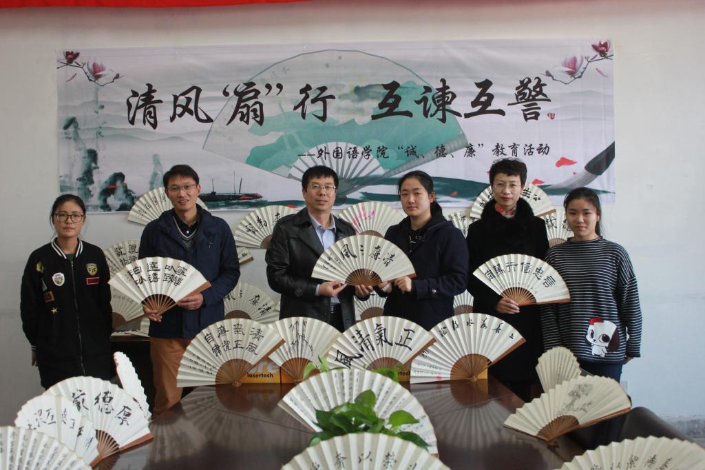 为深入贯彻落实十九大精神,进一步推进党风廉政建设和反腐败斗争,营造风清气正的良好校园政治生态,外国语学院从实践出发,师生互动,开展了“清风‘扇’情 互谏互警”为主题的“诚、德、廉”教育活动。