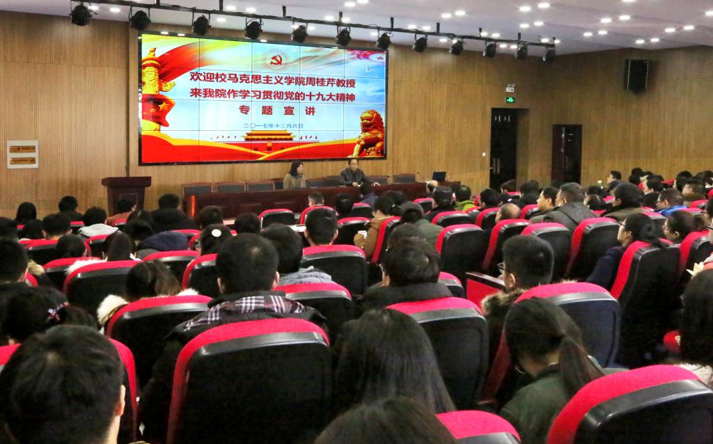 为引领带动应用技术学院掀起学习宣传贯彻十九大精神热潮,把全院师生思想和行动统一到党的十九大精神上来,12月7日下午,应用技术学院在敦行楼报告厅举办学习党的十九大精神辅导报告会,邀请校十九大精神宣讲团成员、马克思主义学院周桂芹教授作《新思想引领新时代 新使命开启新征程》的专题辅导报告。报告会由学院党委书记周清华主持,全院教职工和学生党员及部分入党积极分子190余人参加会议。
