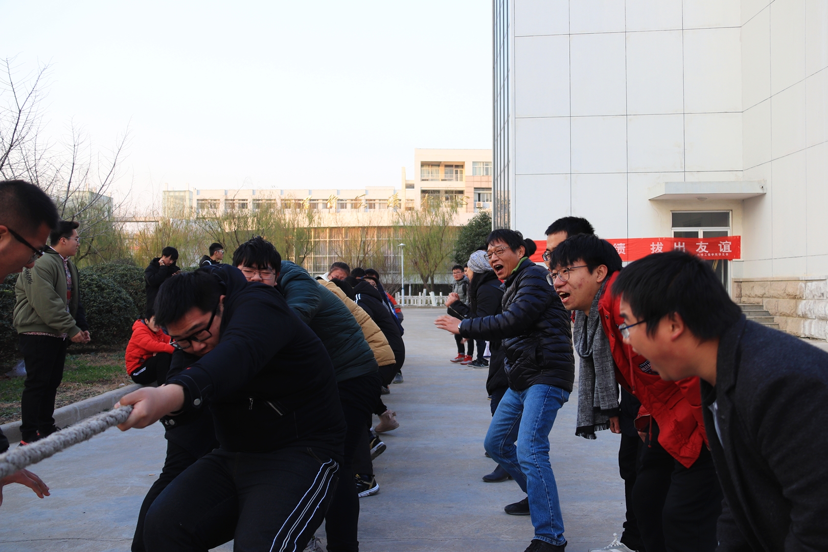 12月10日下午,机械楼广场响起此起彼伏的哨声、加油声、呐喊声,学院2017年师生拔河比赛隆重进行。参加本次比赛的共有六支队伍,分别是机械系、机电系、装备与工程系、船舶系、实验中心、办公室师生联队。院长文西芹、党委书记毛纪登也参加了比赛。