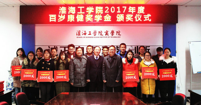 “百岁康健奖学金”系淮海工学院98级市场营销专业优秀毕业生、无锡百岁康健科技发展有限公司华东大区总经理庄士金为感谢母校的培育,履行校友的社会责任,促进母校的教育发展并奖励母校商学院专业的优秀人才而出资设立的奖项。每年出资8万元,连续两年,定向奖励商学院的优秀学生。