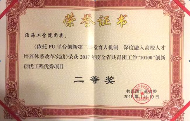近日,共青团江苏省第十四届委员会第八次全体会议在南京召开。为表彰先进、推广典型,更好地调动全省各级各类团组织争先创优的积极性,会上对2017年度全省共青团工作“10100”创新创优工程优秀项目进行了表彰。其中,我校《依托PU平台创新第二课堂育人机制,深度融入高校人才培养体系改革实践》项目荣获优秀项目二等奖。本次评选共设一等奖10名,二等奖共20名,三等奖30名。