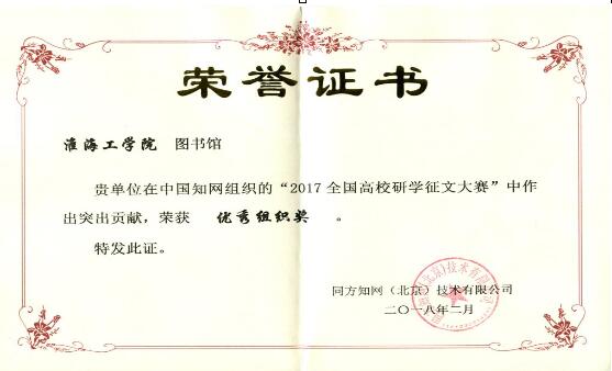 2017年9月,淮海工学院组织学校师生参加了面向全国本科高等院校师生开展的“CNKI研学平台上线暨2017全国高校研学征文大赛”活动,活动的目的是提倡移动学习,让学习不再局限于纸质阅读的枯燥无味,充分发掘学生的创新思维。此次研学征文大赛得到了我校师生的积极响应,图书馆通过新媒体雅读推送活动通知,在投稿的作品中选送了图书馆姚宁老师的《遍寻青春好韶光当时只道是寻常》、艺术学院徐静青同学《我和图书馆的故事》、文学院陈悦同学《和你相遇、是一场美丽的邂逅》、海洋学院陈韵竹同学《唱出阳光的地方》等作品参赛。经过网络投票和中国知网专家评审团的评审,该活动共评选出优秀组织奖8名、个人奖41名,我校图书馆获得优秀组织奖,选送作品获个人二等奖和参与奖各一项。