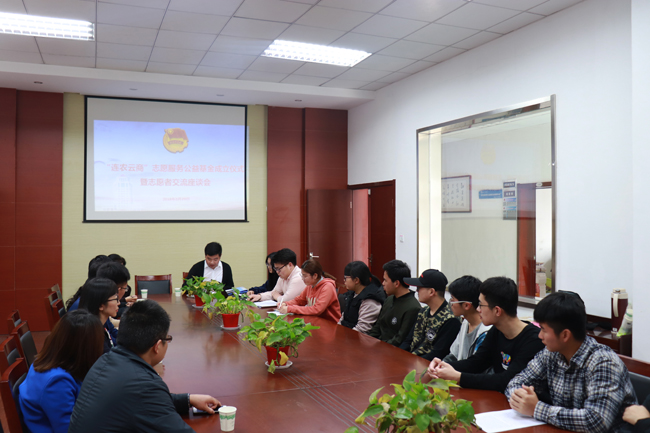 3月29日,“连农云商”志愿服务公益基金成立仪式暨志愿服务工作交流座谈会在大学生活动中心会议室举行。副校长金芙蓉,淮海工学院2016届校友、江苏连农云商科技有限公司董事长浦亚,团委全体工作人员以及部分志愿者骨干参加了此次活动。