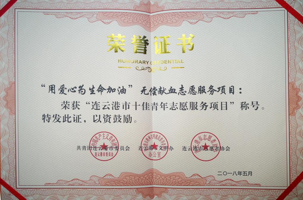 近日,由共青团连云港市委、连云港市文明办、连云港市志愿者协会组织开展的连云港市十佳志愿行动评选表彰活动结果揭晓,通过组织申报、材料初审、专家评审等环节,应用技术学院“用爱心为生命加油”无偿献血志愿服务项目荣获“连云港市十佳青年志愿服务项目”殊荣。日前,团市委在我校举行“聚力创新引领高质发展 聚焦创业助力后发先至”五四青年节系列活动启动仪式,仪式现场对获奖项目进行了颁奖。