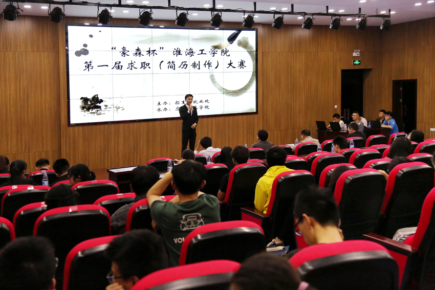 5月23日下午,由校招生与就业处主办、应用技术学院承办的“豪森杯”淮海工学院第一届求职(简历制作)大赛决赛在宋跳校区敦行楼201报告厅举行。江苏豪森药业股份有限公司人力资源总监何莹、连云港中复连众复合材料集团有限公司人力资源部总监杨懿忠、太阳雨集团有限公司人力资源部总监张景斋、连云港杰瑞电子有限公司人力资源部招聘主管周备备担任决赛评委,应用技术学院院长樊华、校招生与就业处副处长姜兵、应用技术学院党委副书记、副院长万金店等出席活动。
