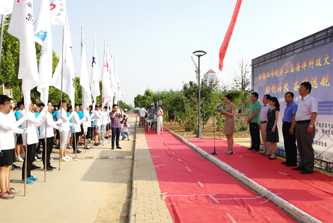金芙蓉宣布第三届海洋科技文化周开幕,并为学生代表授旗。党委宣传部副部长周锦忠对本届海洋科技文化周的活动安排做了简单介绍,并号召广大师生积极参与进来。校学生会主席严文娟代表学生组织宣读倡议书,号召全体同学树立海洋保护意识、繁荣海洋特色校园文化、加强学风建设、改善精神面貌,为大学创建做出贡献。最后,体育学院党总支书记阙建定启动“立海之志·启梦出征”校园彩虹跑活动。