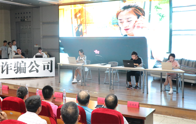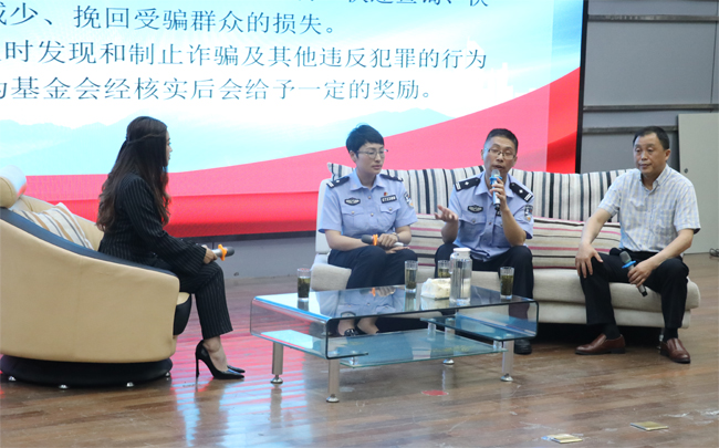 本次访谈活动的主题是防范网络电信诈骗。活动以情景剧表演开始,向现场观众再现了四种典型电信网络诈骗的全过程。访谈正式开始后,连云港高新区公安分局的李警官、姜警官及我校保卫处处长马建新登台与主持人面对面。大屏幕播放了校内诈骗案例的VCR视频,两位警官向大家介绍了48种诈骗手段,分析诈骗案件高发的主客观原因和骗子的作案手法,并提醒广大师生保护好自己的个人隐私。马建新向观众们介绍了保卫处工作开展情况,并通过精心准备的VCR视频为大家讲解了诈骗案件的报案流程。整个活动现场气氛热烈,三位嘉宾妙语连珠,潜移默化地给现场观众上了一堂生动的防诈骗课。