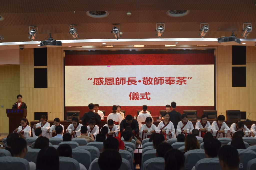 典礼在庄严的国歌声中拉开帷幕。“感谢师长,敬师奉茶”仪式在悠扬的乐曲声中举行。伴随着古朴富有韵律的奉茶词,身穿汉服的同学们手捧茶盏,从会场两侧缓缓走向台前。他们郑重地给老师递上茶盏,并深深弯下腰行揖礼。老师们接过学生手中的茶盏,脸上洋溢着欣慰的笑容。一举一动之间,充满了学生对师长们的敬意和感恩之情。