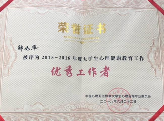 近日,从第十三届全国大学生心理健康教育与咨询学术交流会上传来消息,我校学生工作处解如华老师被评为“2015-2018年度大学生心理健康教育工作优秀工作者”,全省共有11人获该荣誉称号。本次获奖不仅彰显了我校心理健康教育工作人员尽心服务、踏实奉献的精神风貌,也是我校多年来重视和加强大学生心理健康教育工作成果的集中展现。此前,我校曾被评为2011-2014年度苏北地区高校大学生心理健康教育工作先进集体及先进个人,2016年被评为江苏省大学生心理健康教育工作先进集体及先进个人。