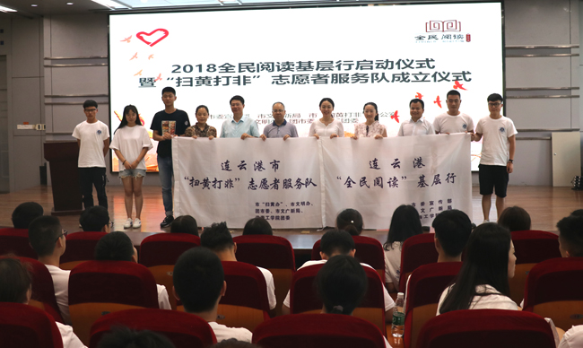 7月11日下午,连云港市2018年全民阅读专项社会实践活动启动仪式暨“扫黄打非”志愿者服务队成立仪式在艺术楼报告厅举行。市文广新局、市文明办、团市委、市“扫黄打非”办、校团委等单位和部门负责人出席活动,150余名志愿者参加启动仪式。