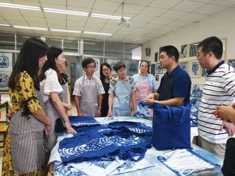 蓝染是一种古老的印染工艺,最早出现于秦汉时期。工艺中又有蜡缬、绞缬、夹缬等花纹的印染。在充满蓝染作品的工作室里,大家围在工作台旁,王栋老师如数家珍地向大家介绍蓝染的工艺和技法。老师们认真观看王老师的每一个细节,每种样式都学习的有模有样。学的最投入的当属Geradine,她来淮工从教一年多,此次她专程来到工作室了解蓝染文化。谈及来中国之后的变化,她说,中国给了她全新的体验,她对遇到的每一件事都很感兴趣,尤其是中国的传统文化,十分吸引她。