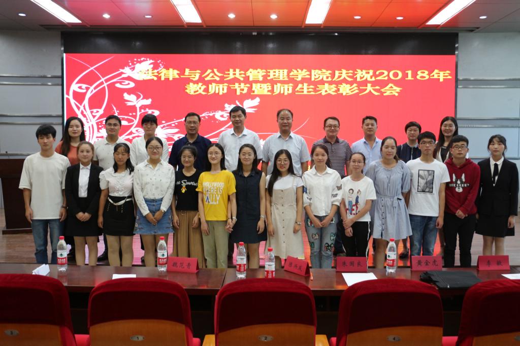 9月9日下午,法律与公共管理学院庆祝2018年教师节暨师生表彰大会在艺术楼报告厅隆重举行。学院党政领导朱国良、陈兴发、黄金虎、魏范青、李敏出席大会,学院全体教师及学生代表200余人参加大会,大会由学院党总支副书记、副院长黄金虎主持。