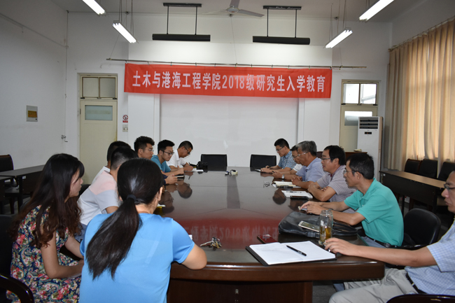 9月12日下午,土木与港海工程学院开展2018级研究生入学教育活动。学院党政领导吴建新、张三柱、宗钟凌等,研究生导师田安国、顾炳伟、蒋德稳教授,党政办、教务办、学工办负责人,2018级研究生新生及部分老生共同参加。入学教育活动由副院长宗钟凌主持。
