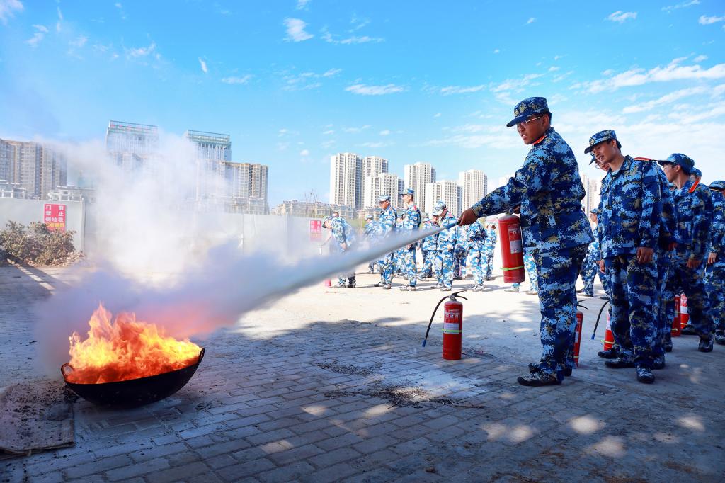 几位教官先给全体新生进行灭火演示,教官拿着灭火器细心地指导大家如何正确使用,特别强调使用的详细步骤及需要注意的细节。随后,消防教官拿起一个灭火器走到火苗前,对准大火的根部进行喷射,作示范讲解。最后,在消防教官的指导下,学生代表分组拿起地上的灭火器,按照教官所讲的要领进行灭火实战演练,将模拟的火灾现场迅速扑灭。