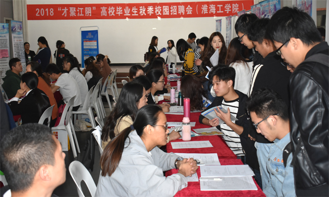 10月12日,2018年江阴市用人单位专场校园招聘会在我校艺术楼多功能厅成功举办。本次招聘会为毕业生提供300余个工作岗位,涉及机械、电子、土木、化学、计算机、食品、财会、法律、管理、设计等多个种类。我校1000余名毕业生参加了本次招聘会,招生与就业处、各学院相关负责老师也来到现场了解企业需求和学生面试情况。