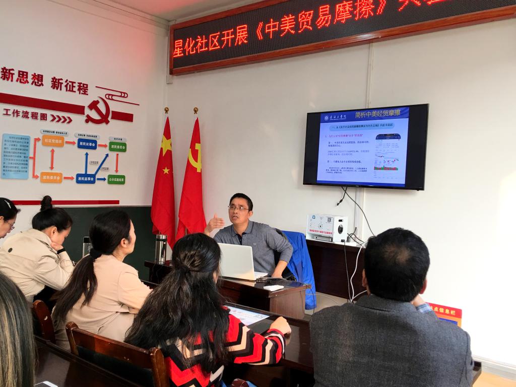 在社区服务中心,马克思主义学院宋忠好老师就如何理性认识中美贸易摩擦上了一堂精彩的专题党课,该社区党员干部群众、辖区内相关单位党员近50人聆听了党课。课上,宋忠好就此次中美贸易摩擦的历史背景、深层原因、如何妥善应对等重要内容进行了深入浅出、旁征博引的讲解和阐述,帮助社区党员干部群众厘清了对中美贸易摩擦的认识。