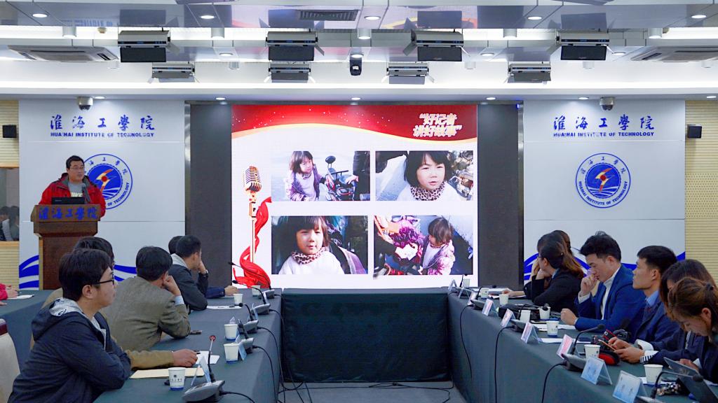 连云港广电传媒集团记者于涛走上台前,讲述他在记者生涯中遇到的两个小女孩的故事。屏幕上出现一张稚嫩的小女孩拿着高过头的扫把在清理马路边的垃圾,“小女孩的母亲手术住进医院,为了获得每天十几元微薄的收入,只好让小女孩代替母亲清理马路上的垃圾。”于涛说道。在女孩的父亲患肝癌不幸离世后,于涛为了让女孩遇到困难时能联系上他,留下了自己的电话号码,但却从来没有接到过女孩的求助电话。唯一的一次电话是过年时的拜年电话,接到电话的于涛留下了眼泪,他说:“即使他们生活很困难,却还是依旧抱着一颗感恩的心在生活。”在场许多同学红了眼眶。