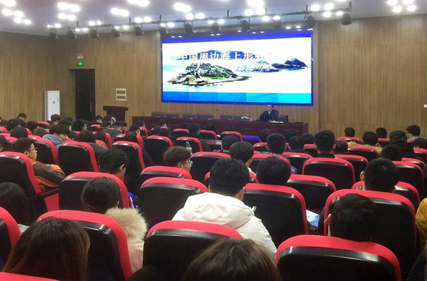 姜齐紧扣当今国际政治、经济形势热点和中韩争端、中日争端、南海岛礁争端态势,分析了中国周边环境的国防现状和现阶段面临的来自海上的主要国防威胁。姜齐强调,我国边境线较长,邻国多,地理条件复杂,容易引发各类争端。只有不断发展自己,壮大自己,在坚持国家利益的前提下,尽最大努力搞好邻国关系。姜齐希望同学们要理智看待国内外各种争端,树立居安思危的意识,珍惜来之不易的改革开放形势和伟大成果,共同努力维护国家稳定与发展的大局。讲座数据详实,图片鲜活,语言生动,既有姜齐多年丰富的理论研究成果,又穿插了他在一线部队担任航海长、舰长时亲身参与海上维权的案例,会场不时响起阵阵掌声。