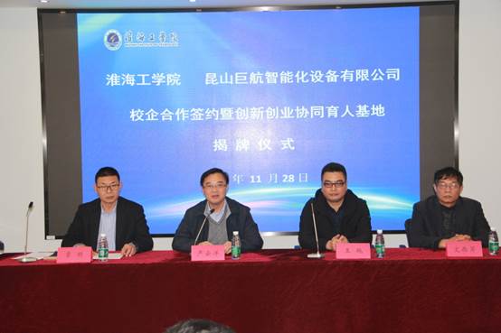 11月28日下午,创新创业学院与昆山巨航智能化设备有限公司共建创新创业协同育人基地揭牌仪式在我校举行。副校长严云洋、昆山巨航智能化设备有限公司总经理王飚、机械与海洋工程学院院长文西芹等参加了揭牌仪式,仪式由创新创业学院副院长掌明主持。