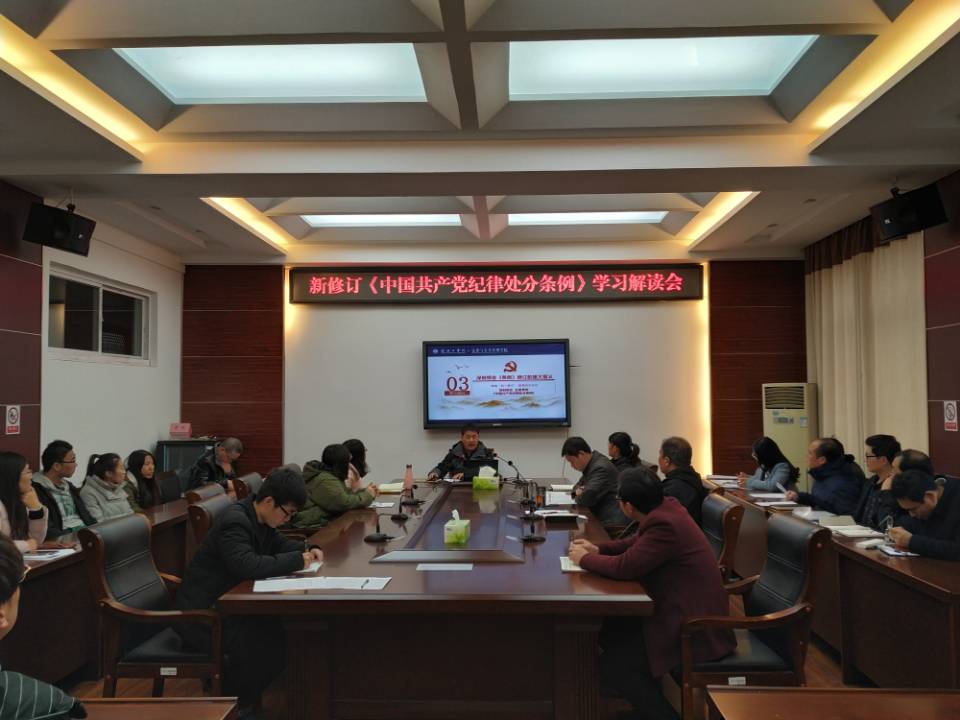 12月5日下午,法律与公共管理学院在文渊楼216会议室召开全体党员大会,对新修订的《中国共产党纪律处分条例》(以下简称《条例》)进行系统的学习。