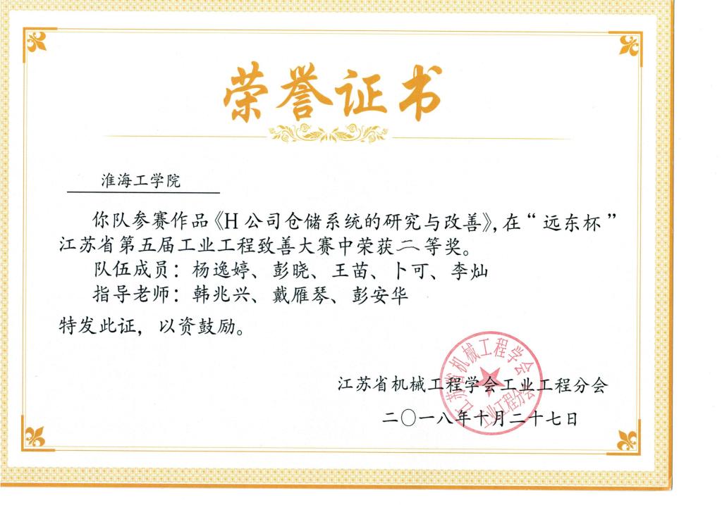 近日,江苏省机械工程学会工业工程分会年会暨“远东杯”江苏省第五届工业工程致善大赛在江南大学成功举办。经过激烈角逐,我校机械与海洋工程学院韩兆兴、戴雁琴、彭安华老师指导,学生杨逸婷、彭晓、王苗、卜可、李灿完成的参赛作品“H公司仓储系统的研究与改善”荣获二等奖,我校获评本次大赛“优秀组织奖”。
