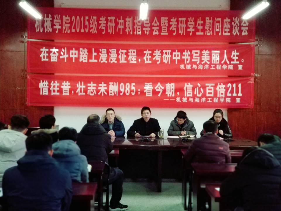 12月10日上午,机械与海洋工程学院2015级考研冲刺指导会暨考研学生慰问座谈会在机械楼六楼考研自习室举行。学院党委副书记、副院长赵求勇,副院长陈劲松、张元良,考研专业课指导老师闫海鹏、陈季萍、王振华、訾克明、席平原,全体辅导员老师及2015级考研学生参加了会议。