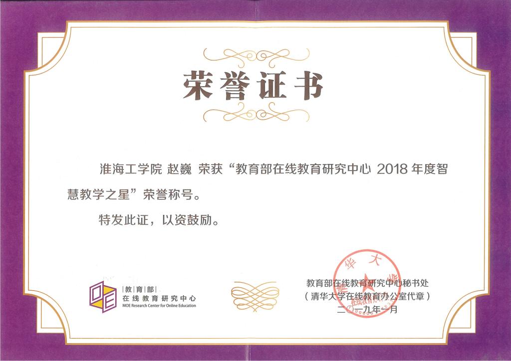 近日,教育部在线教育研究中心公布了2018年度“智慧教学之星”荣誉称号的评选结果。经评审专家评议,我校赵巍老师被评为“智慧教学之星”。