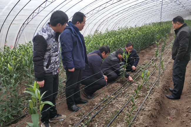 东海县鲜切花产业园位于东海县双店镇境内,为江苏省最大的鲜切花产业基地,花卉种植面积达11000亩,标准日光温室大棚3600余栋,有百合、非洲菊、马蹄莲、郁金香、鹤望兰、玫瑰等20多个系列40多个品种,其中又以百合种植面积最大。在连云港市农科院花卉种植专家的引领下,通过花卉种植专业合作社和基地的实地调研走访,调研组了解到目前国内的花卉育种、栽植、收获和分拣包装等工作几乎全部靠人工完成,占用人工多、功效低、劳动强度大,急需机械化作业机具。调研组与花卉种植专业合作社、市农科院专家达成合作意向,组成联合科技攻关团队,攻克瓶颈约束问题,尽快在百合、郁金香等球茎类花卉的栽植和收获机械化装备研发方面实现突破,尽早实现机器代人。