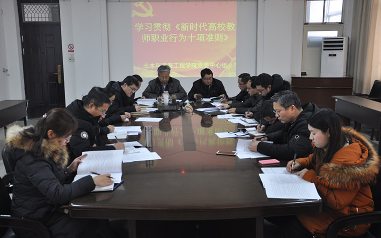 2月27日下午,土木与港海工程学院党委中心组组织集中学习《新时代高校教师职业行为十项准则》。学院党委及班子成员、党支部书记、党政办主任等参加,学院党委书记吴建新主持学习活动。