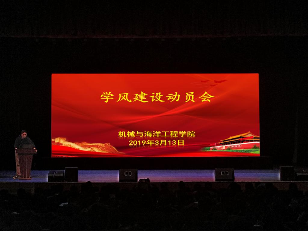 为进一步贯彻新时代全国高等学校本科教育工作会议精神,坚持“以本为本”,落实校第四次党代会关于全面提升人才培养质量的要求,3月13日晚,机械与海洋工程学院在大礼堂召开学风建设动员大会。学生处副处长张志浩、学院党委书记毛纪登、副书记赵求勇,全体辅导员及苍梧校区1300余名学生参加了大会。