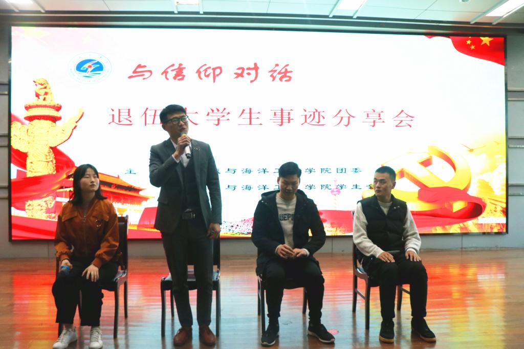 为弘扬以爱国主义为核心的民族精神,坚定广大青年学生“四个自信”,4月17日下午,机械与海洋工程学院在艺术楼报告厅举办“与信仰对话——退伍大学生军旅生涯事迹”报告会,讲述身边故事,弘扬先进典型。学院党委副书记赵求勇、辅导员王楠与200多名同学一起聆听了报告会。
