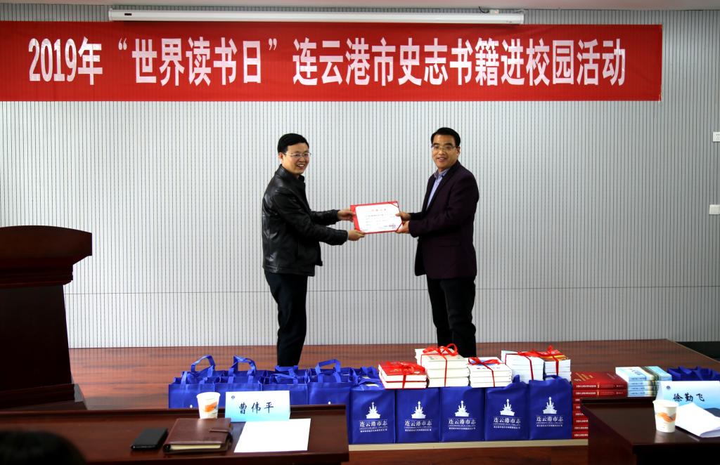曹伟平讲话,他对市地方志办公室捐赠史志图书表示欢迎,同时也强调了阅读的重要性。徐勤飞详细介绍了此次捐赠图书的内容及意义,希望此次捐赠的《连云港市志(1984-2005)》《连云港年鉴(2018)》及《中国共产党连云港市执政实录》等100册图书能够丰富淮海工学院图书馆的文献资源,并期待与我校图书馆开展更多的合作。最后,曹伟平为捐赠者颁发了捐赠证书。