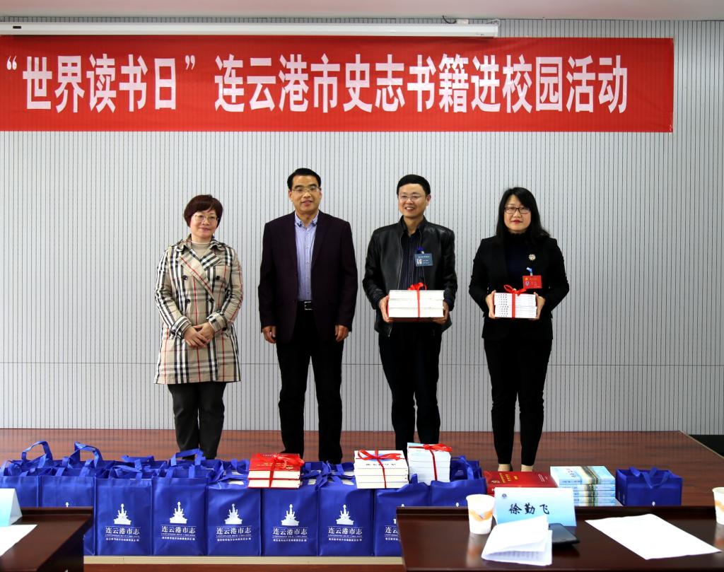 为弘扬地方历史文化,推动地情知识普及,4月24日下午,2019“世界读书日”连云港市史志书籍进校园活动暨史志图书捐赠仪式在图书馆东馆302室举行。淮海工学院教师及同学代表约100人参加了捐赠仪式。图书馆馆长曹伟平、副馆长艾华,市地方志办公室主任徐勤飞、副主任陆瑞萍及方志年鉴处有关领导出席了捐赠仪式。捐赠仪式由艾华主持。