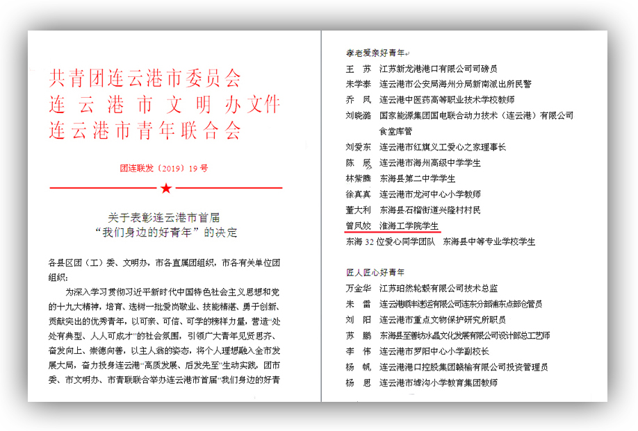 日前,由共青团连云港市委员会、连云港市文明办、连云港市青年联合会联合评选表彰的连云港市首届“我们身边的好青年”名单揭晓,应用技术学院学生社团党支部党员、Z中文161班曾凤姣同学榜上有名,获得“孝老爱亲好青年”荣誉称号。