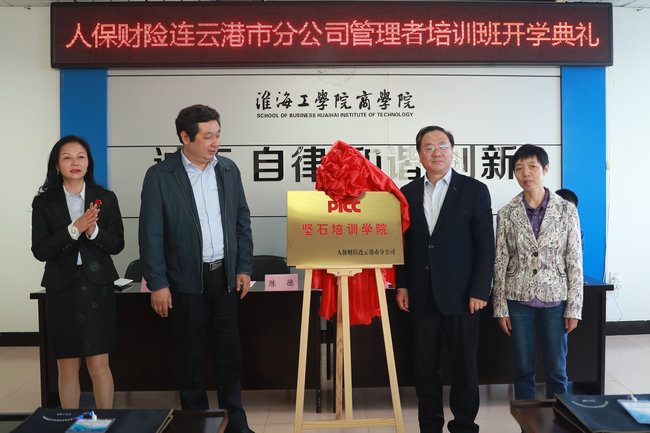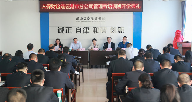 近日,人保财险连云港市分公司管理者培训班开学典礼暨“坚石培训学院”揭牌仪式在我校商学院会议室举行。人保财险连云港市分公司总经理陈德、副总经理张霄鹏,商学院党委书记杨天华、院长宣昌勇及培训老师、学员等共50余人参加了仪式。开学典礼由商学院院长助理孙军主持。