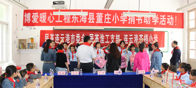 在六一儿童节来临之际,5月28日,由民革连云港市委、淮海工学院党委统战部共同举办,民革淮工支部、连云港市苍梧小学承办的“博爱•暖心工程——筑梦书香 健康前行”活动在东海县房山镇举行。民革市委主委李萌,东海县政协副主席王祥武,淮海工学院党委统战部、民革淮工支部、房山镇相关负责人及连云港市苍梧小学师生代表参加活动。