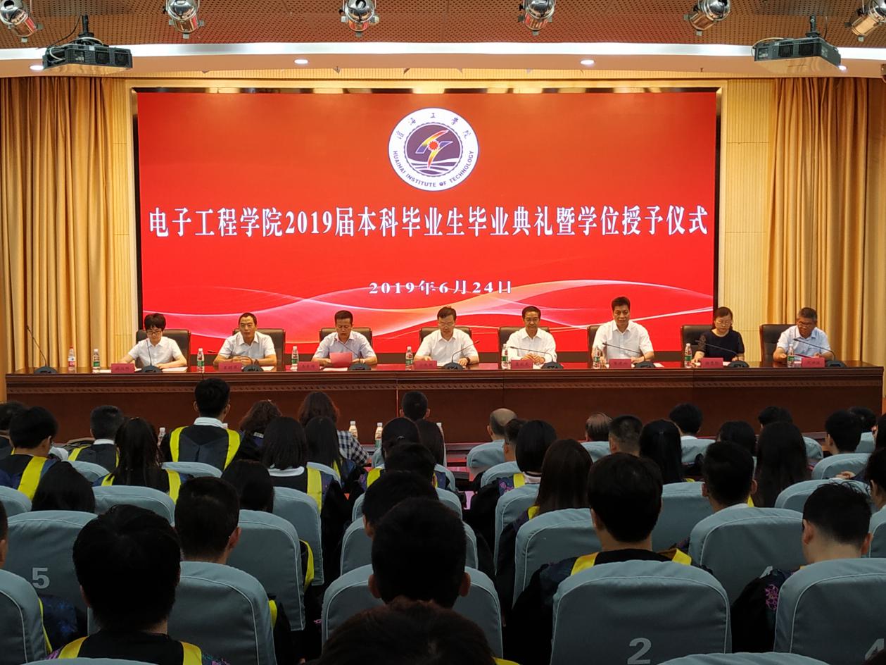 6月24日上午,电子工程学院2019届本科毕业生毕业典礼暨学位授予仪式在会议中心黄海厅隆重举行。校长宁晓明出席活动,学院党政班子成员、教授代表、各系主任、各专业负责人、毕业班班主任、辅导员、全体2019届毕业生参加了典礼。毕业典礼由学院副书记、副院长钱汉珍主持。