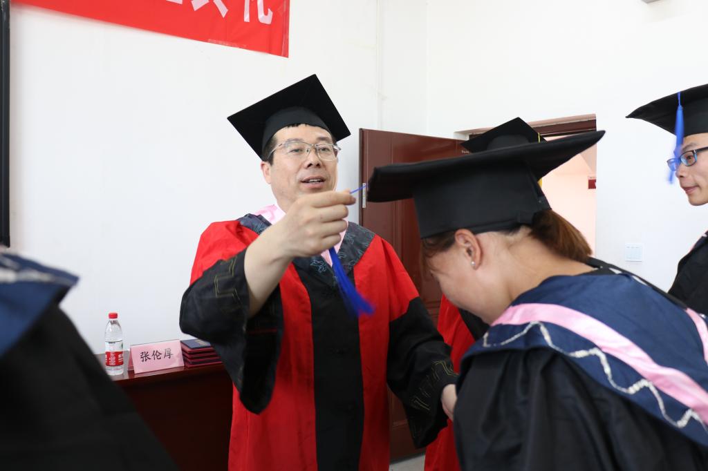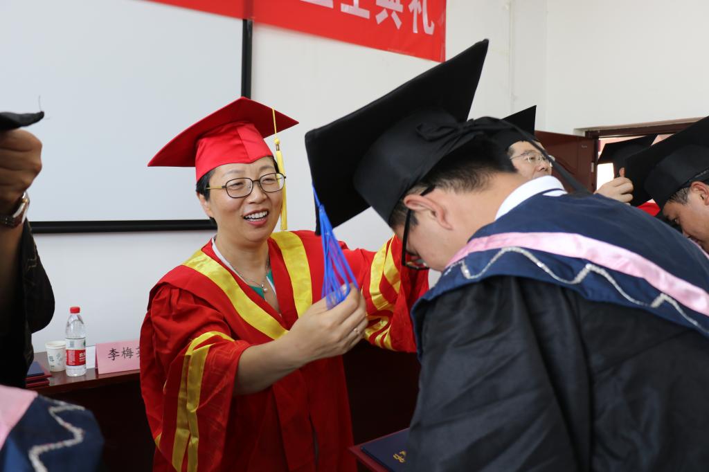 最后,李梅英和学院党政领导为毕业生们颁发学位证书、扶正流苏,并与他们合影留念。