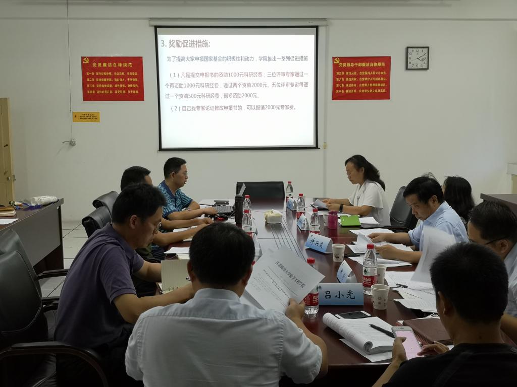 化学工程学院于9月12日下午召开2020年国家基金申报推进会。学院领导传达了副校长许兴友一行调研工作的情况及学校的要求,强调国家自然基金项目对于学校和教师个人发展的重要作用,希望广大教师树立信心、高度重视、尽早谋划、精心撰写申请书,提高申报质量,力争学院2020年国家自然基金申报工作取得新突破。