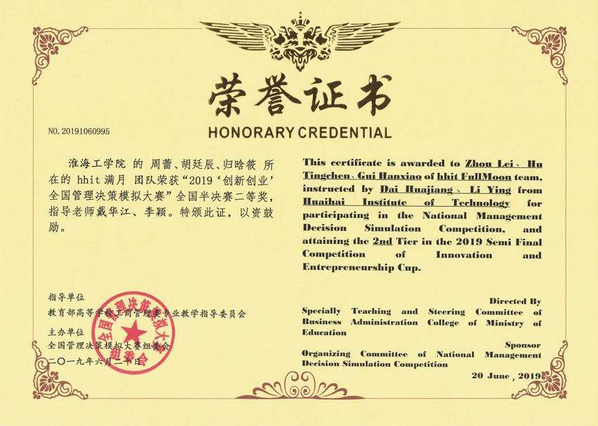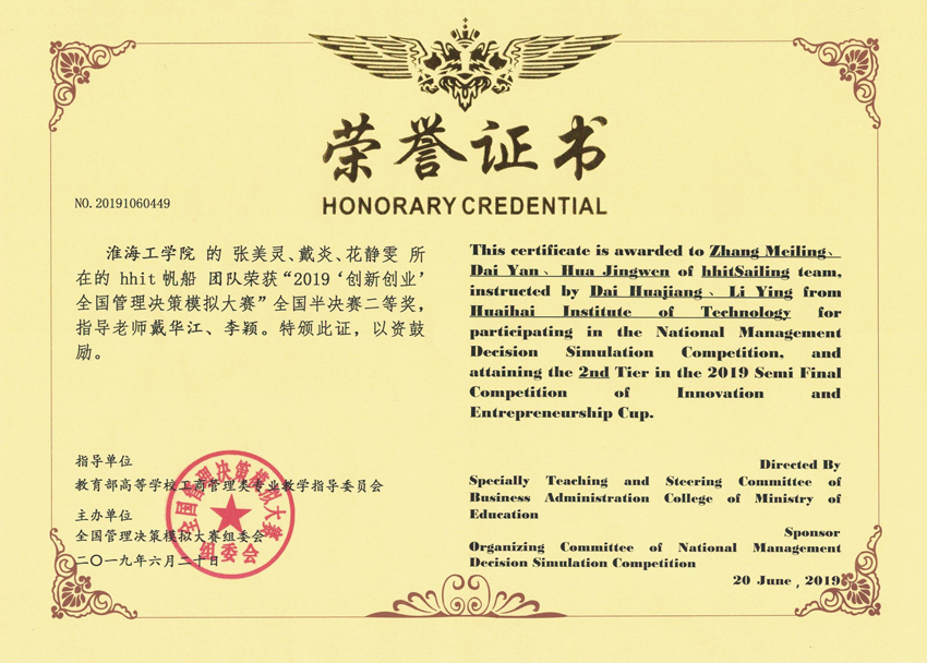 日前,在教育部高等学校工商管理类专业教学指导委员会举办的“2019‘创新创业’全国管理决策模拟大赛”全国半决赛中,应用技术学院代表队“hhit帆船”和“hhit满月”分别荣获团队二等奖。