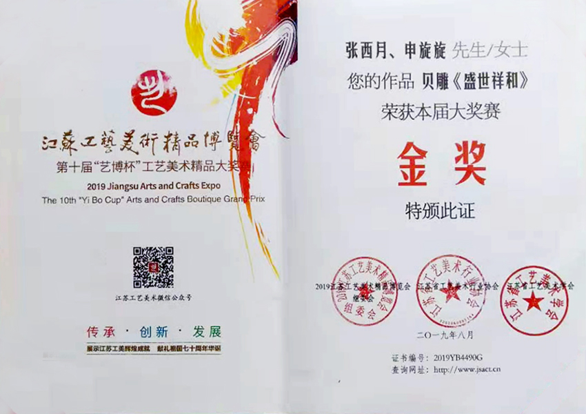 近日,由应用技术学院外聘关工委副主任张西月设计、应用技术学院G机械182班申旋旋同学参与制作完成的贝雕作品《盛世祥和》喜获2019江苏省第十届“艺博杯”工艺美术精品大奖赛金奖。